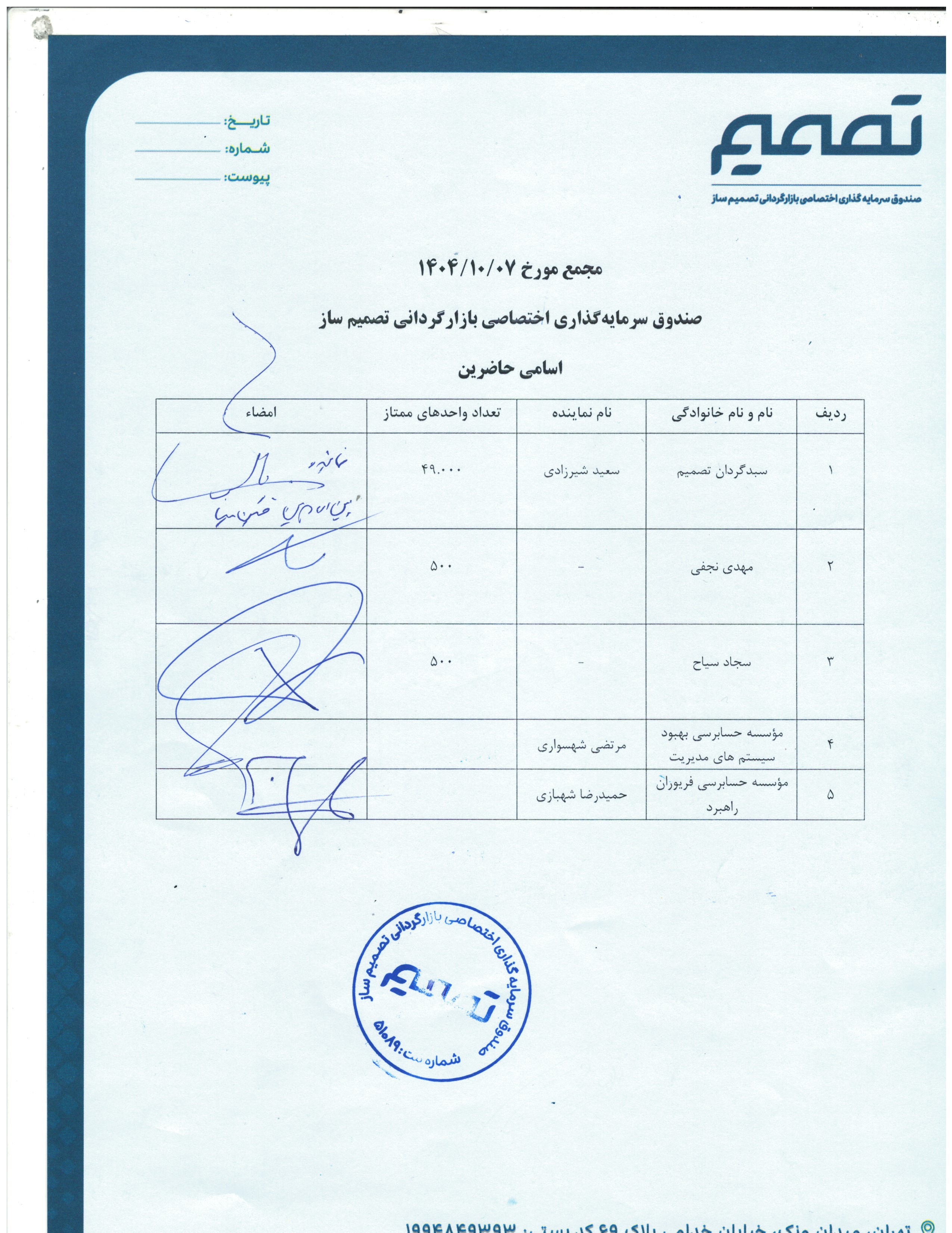 | مقدمه | لیست حاضرین مجمع سالیانه صندوق سرمایه گذاری اختصاصی بازارگردانی تصمیم ساز مورخ 1404/10/07 |