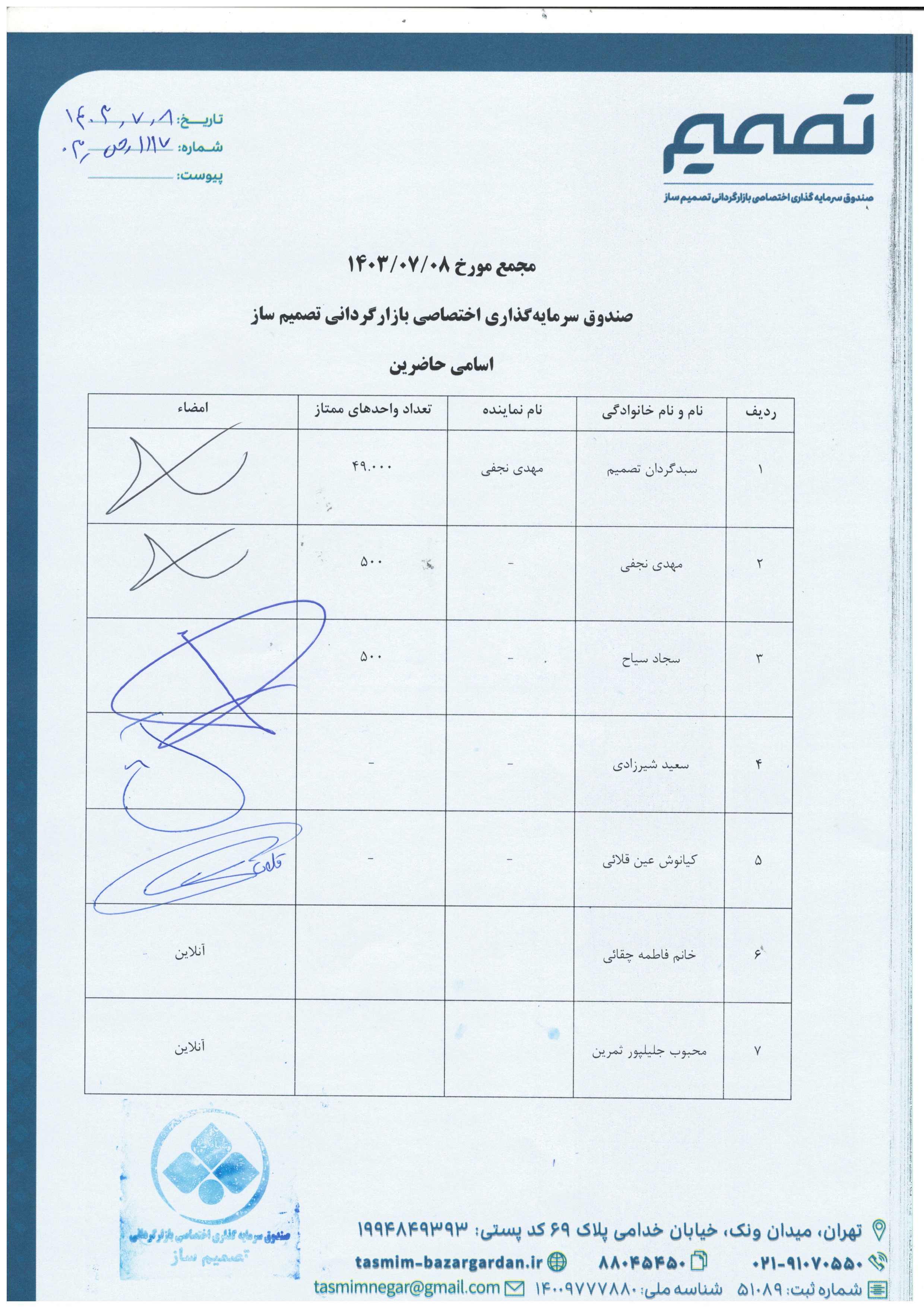 لیست حاضرین در مجمع صندوق بازارگردانی تصمیم ساز به تاریخ ۱۴۰۳/07/08